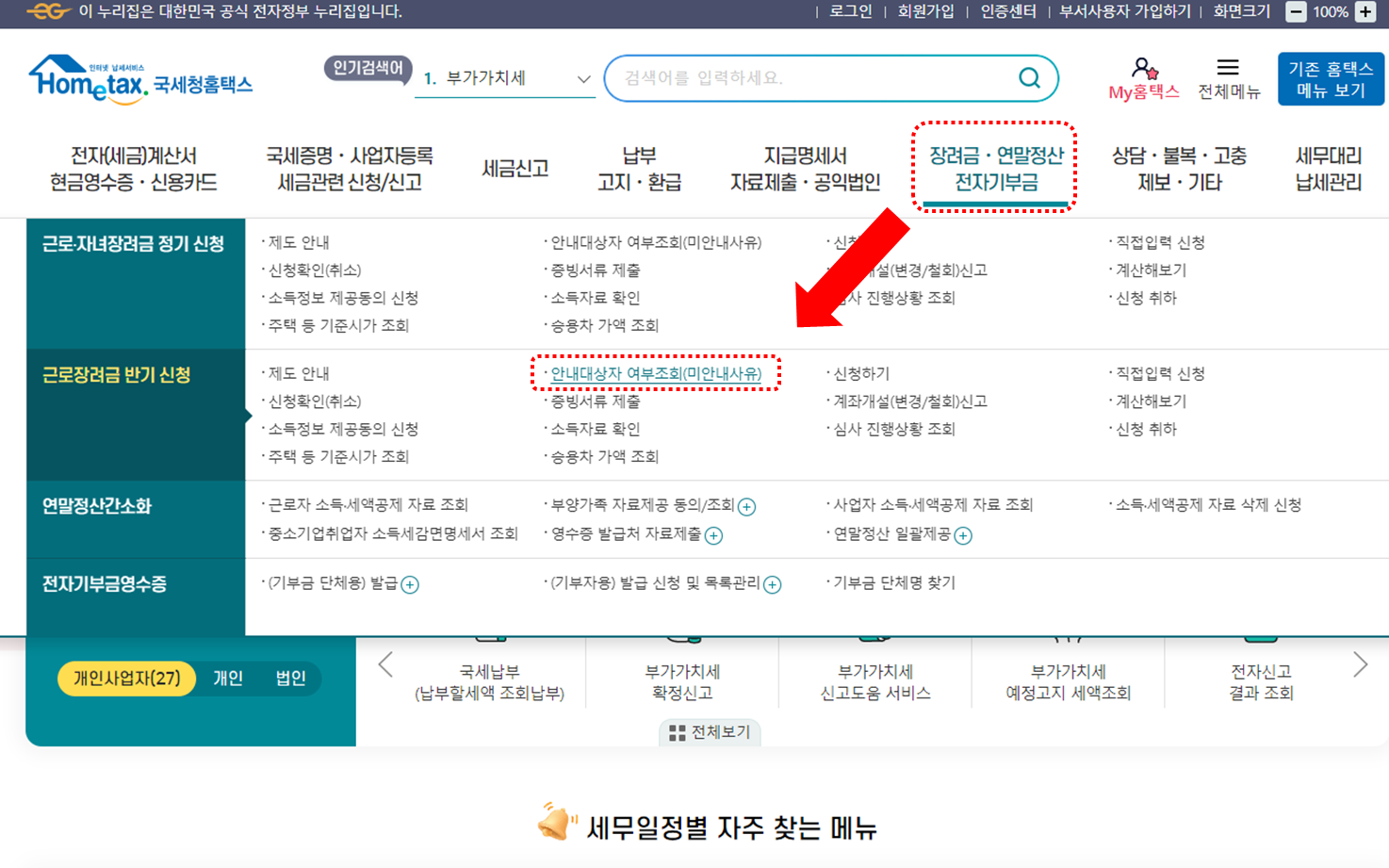 | 신청안내문 미수령 시 | 근로 ·자녀장려금 선택 → 신청하기 선택 | 본인인증(공동인증서/간평인증)시 세대원 명세, 소득자료 등 제공 |