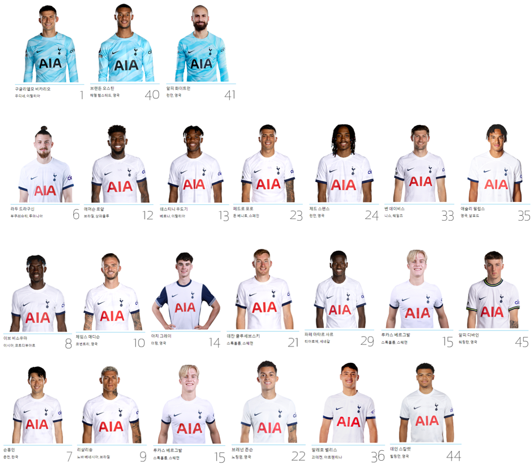 | GK | 비카리오, 화이트먼, 건터, 오스틴 |
