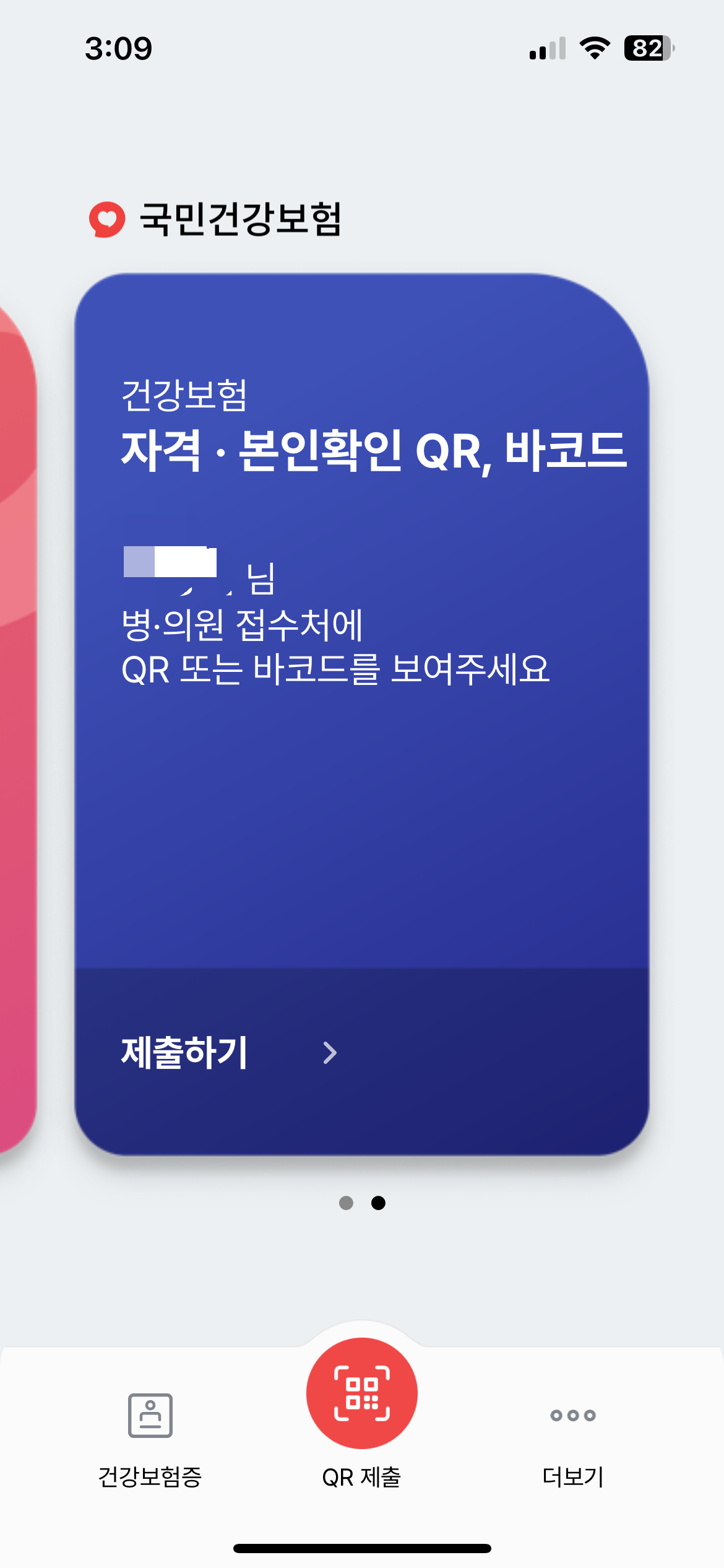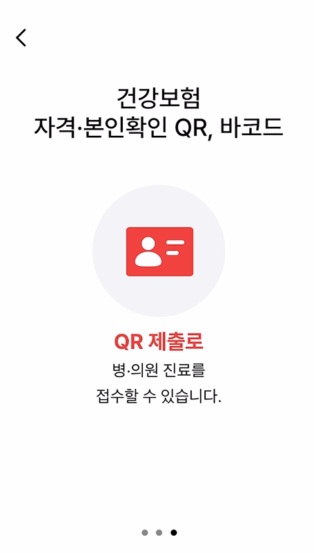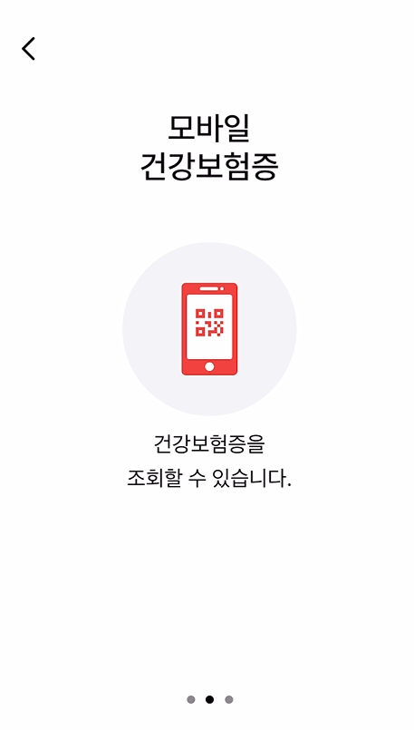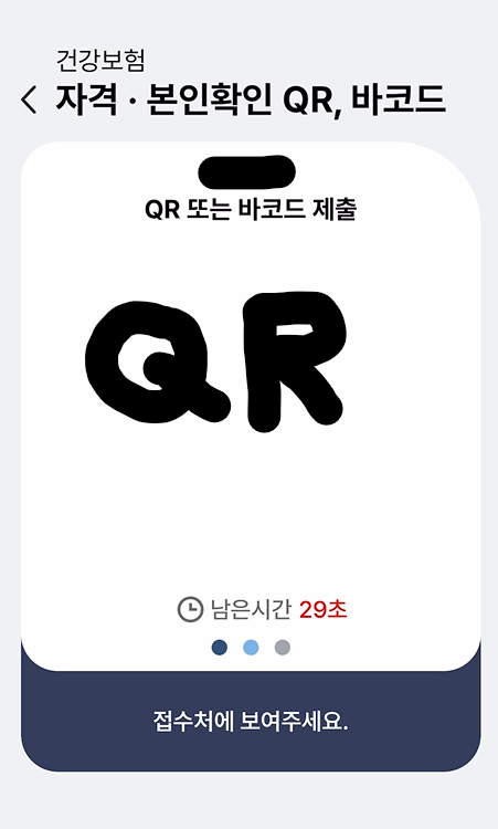 모바일 건증보험증 화면에서 옆으로 넘기면 QR 코드 발급화면이 나옵니다.