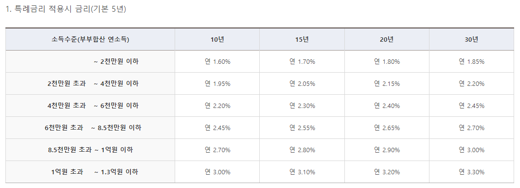 - 연소득 8.5 천만원 이하 : 기존 특례 금리에서 0.55% 가산된 금리 적용